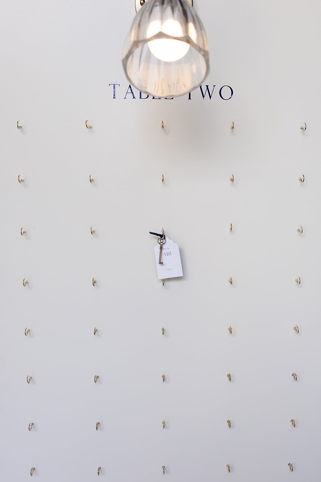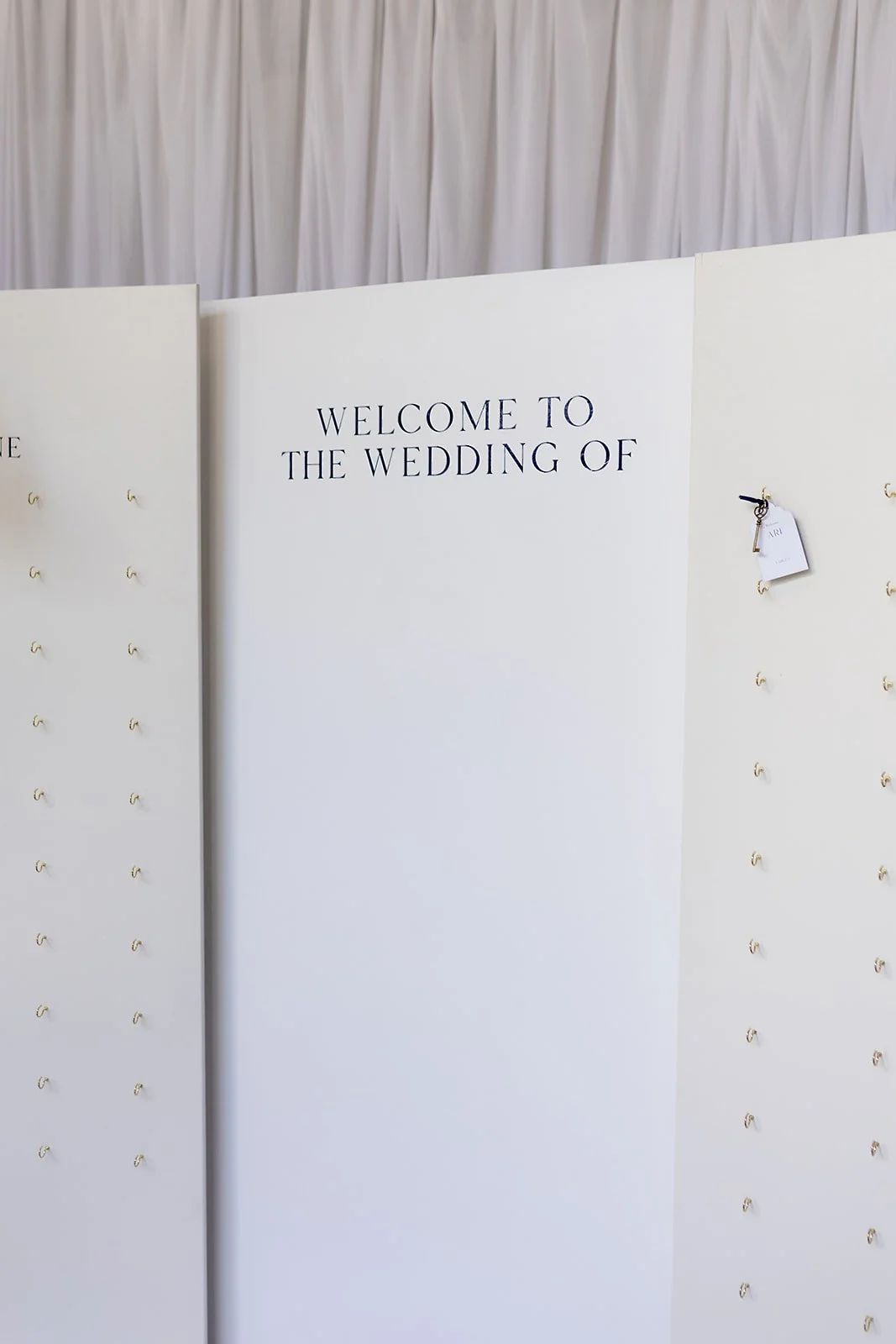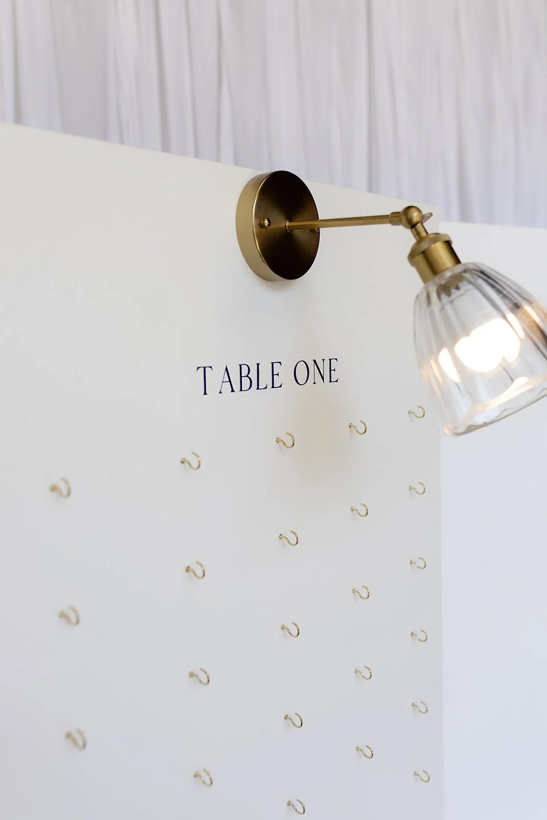 3 panel wooden place card stand with gold hooks for seating charts.